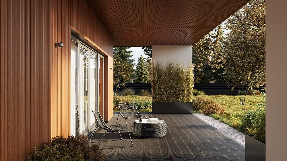 Fronto is an exterior slat panel that can be used both on the façade and as a finish for the ceiling, balcony or terrace.