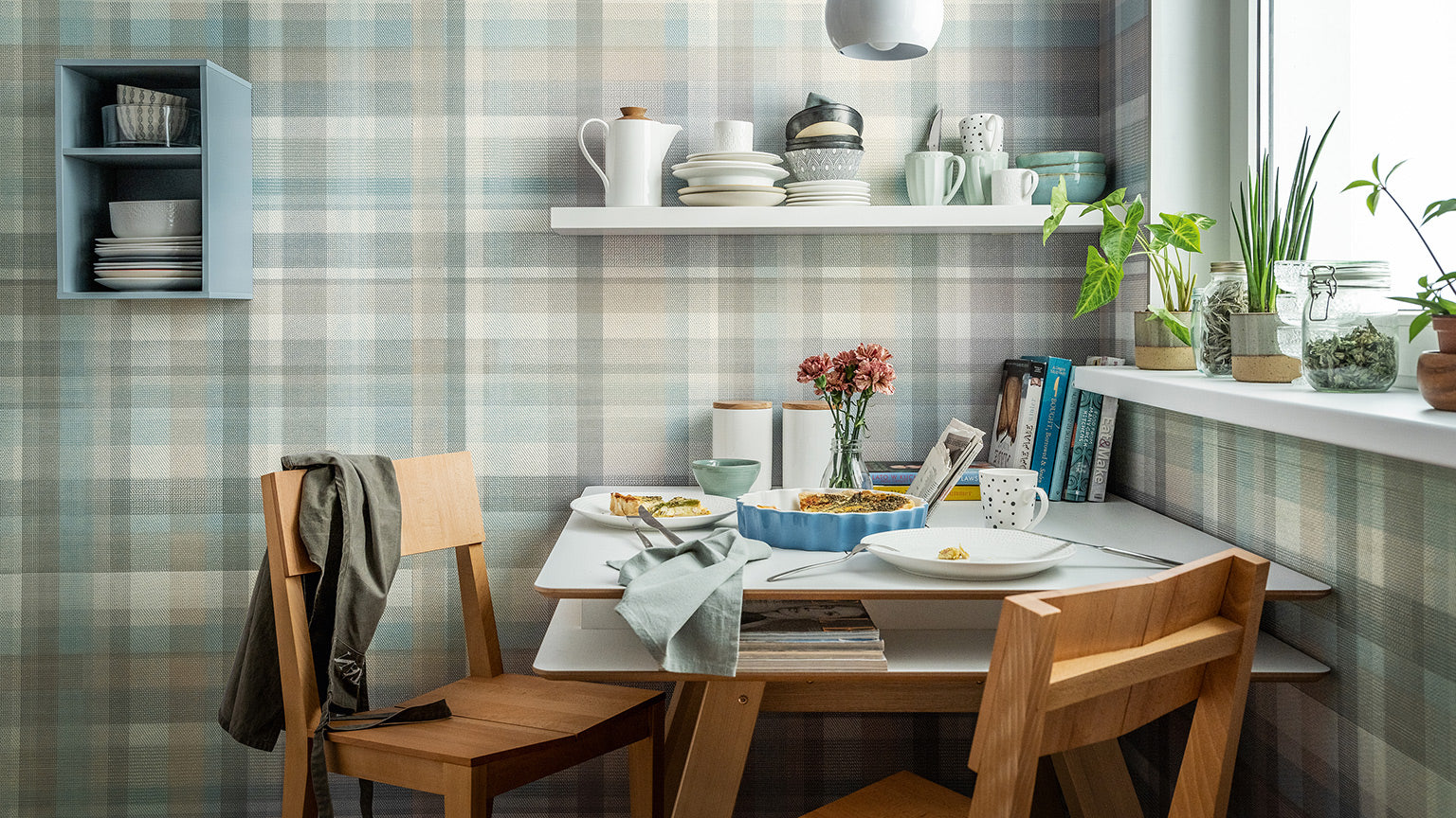 Kerradeco Blue Tartan panels make a cozy wall decoration. The Scottish checked pattern in pastel shades of blue, beige and grey warms up the interior, giving it an interesting rhythm.