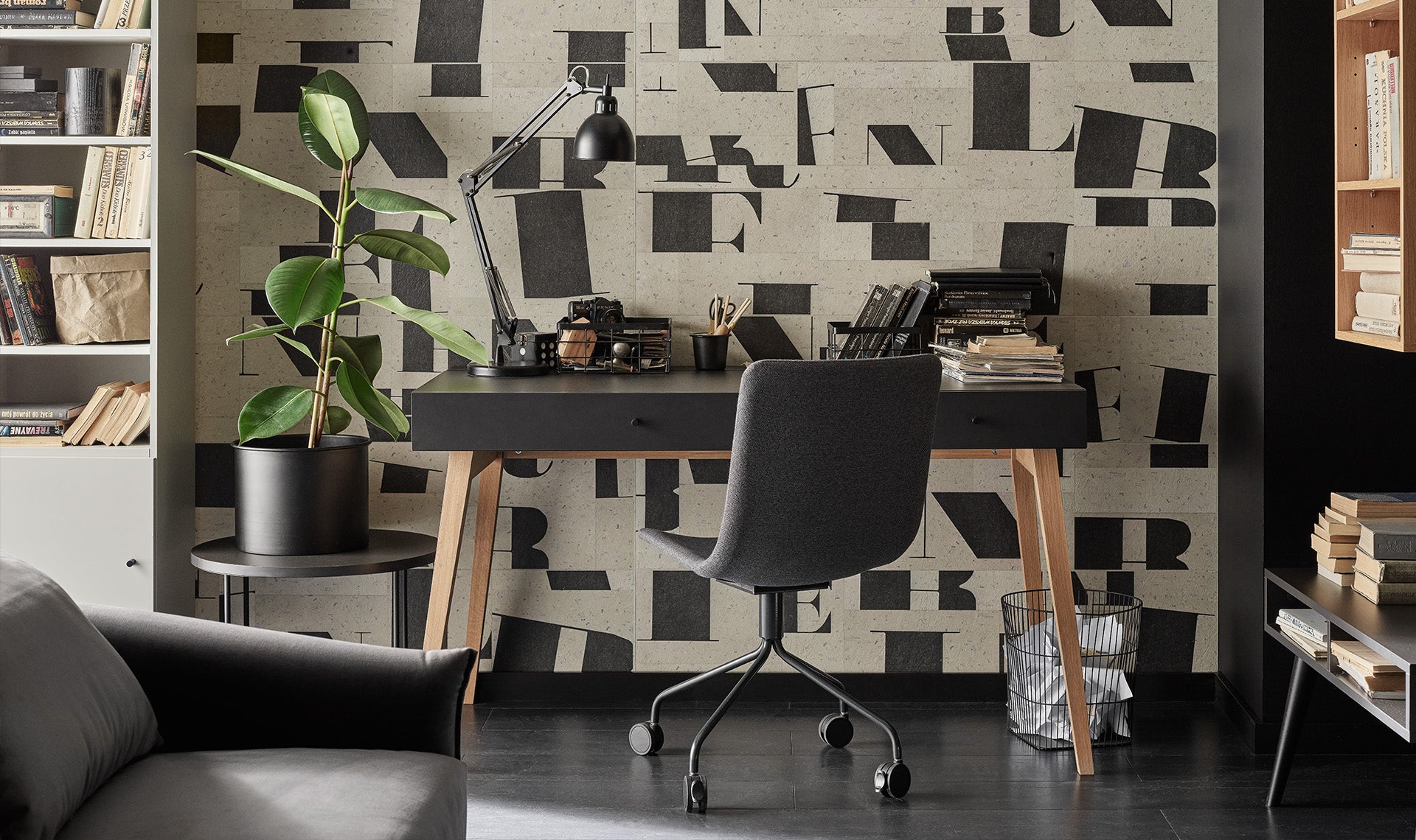 Geometric Typography panels are decorated with a motif of letters outlined in ink on handmade paper. The sturdy wall finish in muted shades of beige and black provides an inspiring backdrop for a studio, office or study.